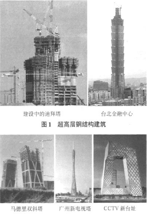超高層建筑是人類征服自然,不斷取得進步的重要標志,是現(xiàn)代科學技術發(fā)展的結晶,也是一個國家科技發(fā)展水平和綜合實力的集中體現(xiàn)之一。因此無論是發(fā)達國家,還是發(fā)展中國家都把興建超高層建筑作為展示社會發(fā)展成就的重要手段。而超高層建筑通常采用鋼結構作為主要構成部分,因此超高層建筑一般都是超高層鋼結構。現(xiàn)代超高層建筑起源于美國,已有110年的發(fā)展歷史,超高層建筑的興建不但具有顯著的經(jīng)濟效益和社會效益,能夠展現(xiàn)一個時代、~個國家的科技發(fā)展成就,而且可以極大地促進相關領域科技的發(fā)展。因此目前興起了超高層建筑建設的新高潮。不僅高度越來越高,如高達492m的上海環(huán)球金融中心,508m的臺北國際金融中心,阿聯(lián)酋超過700m高的Burj Dubai大廈(迪拜塔),圖l。而且超高層建筑造型也更加多樣化,扭轉的廣州新電視塔和傾斜的中央電視臺新臺址建設工程就是其中典型的代表。