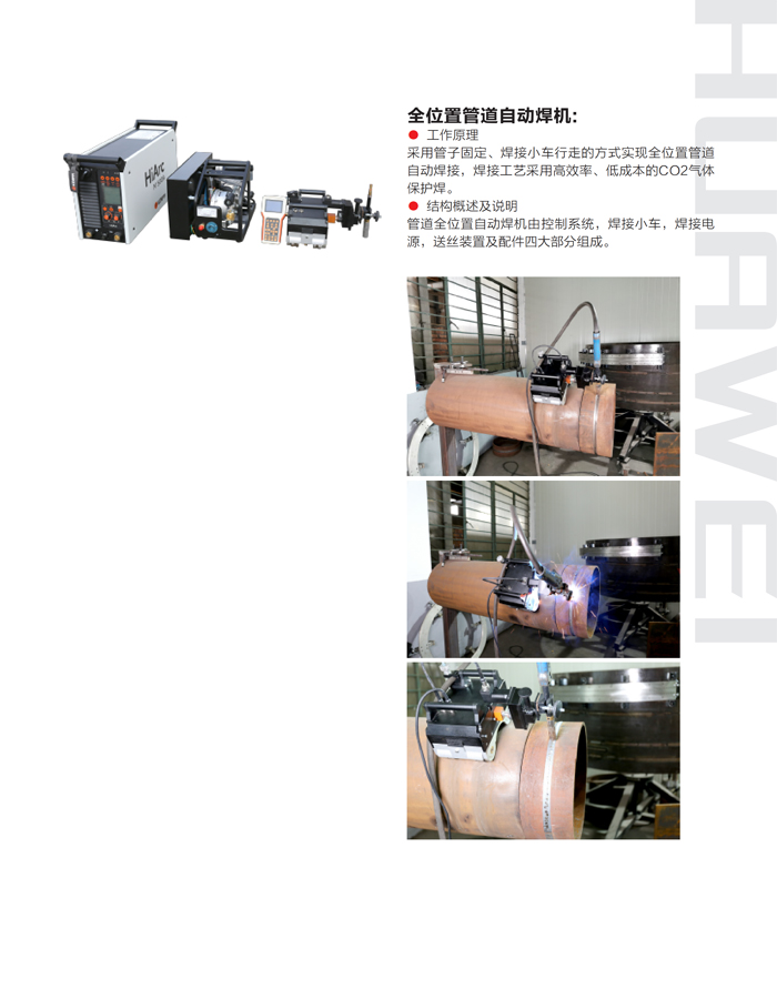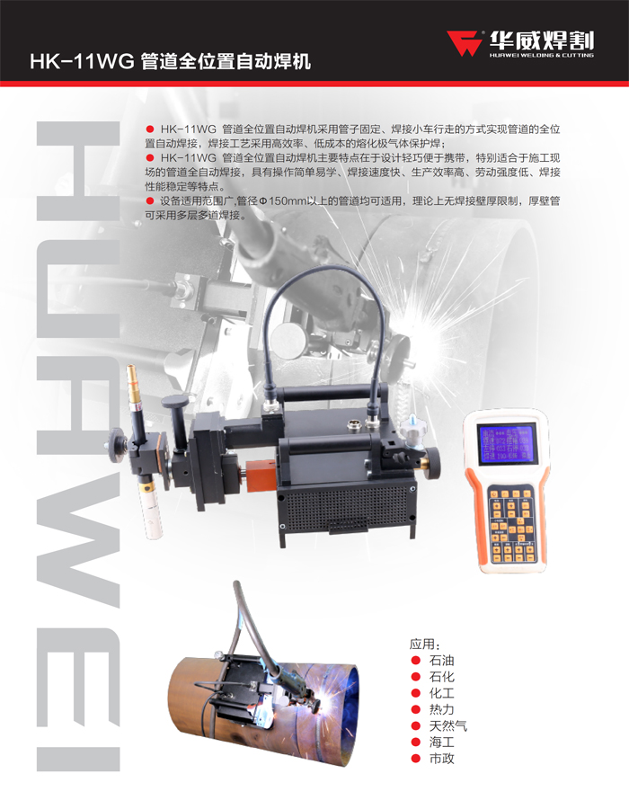● HK-11WG 管道全位置自動焊機采用管子固定、焊接小車行走的方式實現管道的全位置自動焊接,焊接工藝采用高效率、低成本的熔化極氣體保護焊;● HK-11WG 管道全位置自動焊機主要特點在于設計輕巧便于攜帶,特別適合于施工現場的管道全自動焊接,具有操作簡單易學、焊接速度快、生產效率高、勞動強度低、焊接性能穩定等特點。● 設備適用范圍廣,管徑Φ150mm以上的管道均可適用,理論上無焊接壁厚限制,厚壁管可采用多層多道焊接。