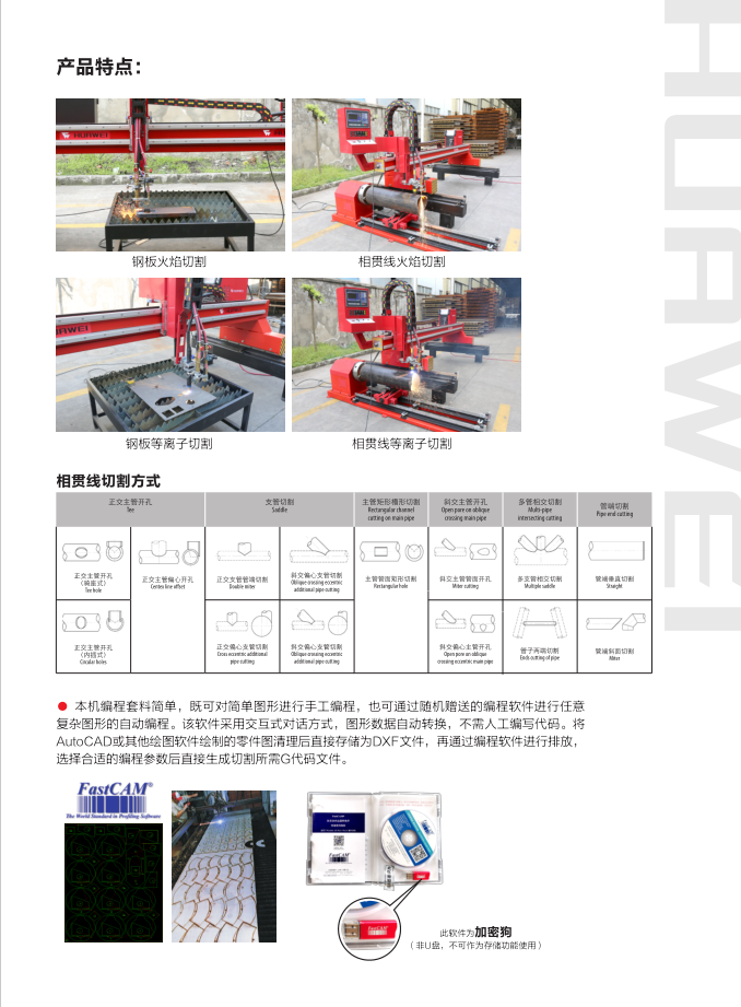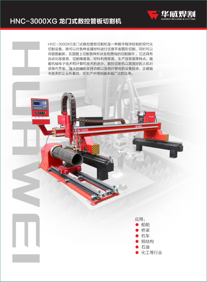 HNC-3000XG龍門式數(shù)控管板切割機(jī)是一種數(shù)字程序控制的現(xiàn)代化切割設(shè)備,除可以對各種金屬材料進(jìn)行任意平面圖形切割,同時可以將圓管截斷,在圓管上切割各種形狀及相貫線的切割操作 ,它還具有自動化程度高、切割精度高、材料利用率高、生產(chǎn)效率高等特點。隨著機(jī)械電子技術(shù)和計算機(jī)技術(shù)的進(jìn)步,數(shù)控切割機(jī)以其良好的人機(jī)對話操作界面、強(qiáng)大的輔助支持功能以及相對很低的設(shè)備投資,正被越來越多的企業(yè)所重視,在生產(chǎn)中得到越來越廣泛的應(yīng)用。