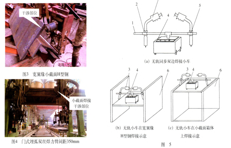(1)無軌同步雙邊焊接小車制作材料同種規格及型號的氣體保護焊機兩臺;用于組立的寬500mm的H型鋼翼板兩塊,寬200mm的腹板一塊;350mm/b截面的箱體翼緣板及腹板各兩塊;管道切割機一臺;管道切割機上連接桿及其轉動軸等。(2)無軌同步雙邊焊接小車構成組成無軌同步雙邊焊接小車的主要結構以及焊接小車在H型鋼及箱型上的應用如圖5所示。(3)無軌同步雙邊焊接小車工作原理首先將CO:氣體保護焊焊槍3固定在連接桿1兩端,將帶有焊槍3的管道切割機小車裝置4置于待焊件6上,通過調節軸系2、5N整焊槍3的焊接角度,待焊槍3角度調節后啟動管道切割機小車裝置4,由管道切割機小車裝置4的行走路徑帶動焊槍3進行焊接寬翼緣H型鋼及小截面箱型。(4)無軌同步雙邊焊接重點剖析第一,管道切割機小車采用車輪為永磁性小車,調整直線行駛路徑,進而帶動氣體保護焊焊槍向前施焊,避免了非磁性小車向前行走過程中行走路徑發生變化。第二,兩臺氣體保護焊焊機選擇型號相同的奧太焊機,焊接前將焊接參數、焊槍角度調節到正常施焊的焊接狀態,避免了不同型號焊機雙邊焊接時不同步對焊縫產生不良影響。第三,焊接前預先將焊接腹板按常規要求采用半自動切割機加工坡口,并利用校正機將板件校正平整,嚴禁利用波浪變形的板件組立、焊接。第四,氣體保護焊焊槍在施焊前需將焊槍穩固的固定在轉動軸上,避免松動影響正常施焊。第五,H型鋼或箱型在正式焊接前,應在端頭加設引弧板及引出板,材質與母材材質相同,進而保證主體焊縫的焊接質量。